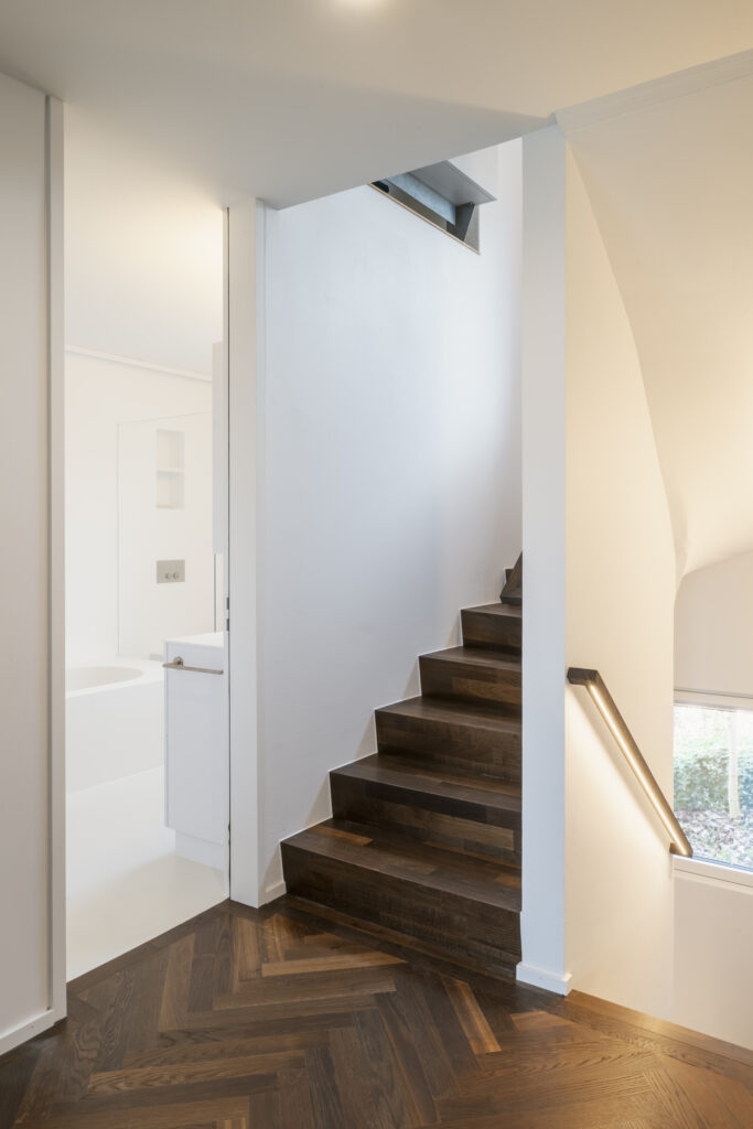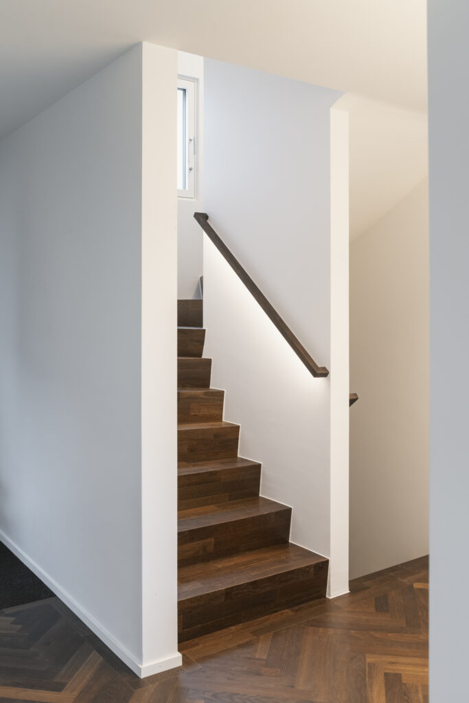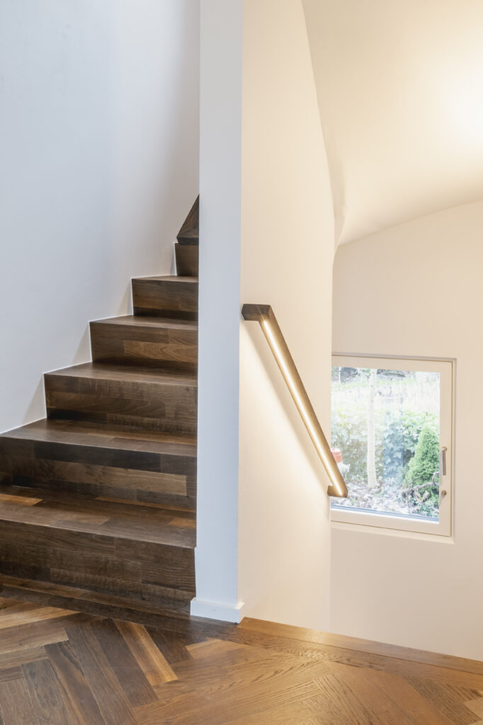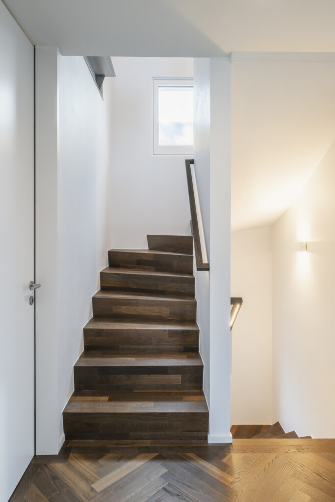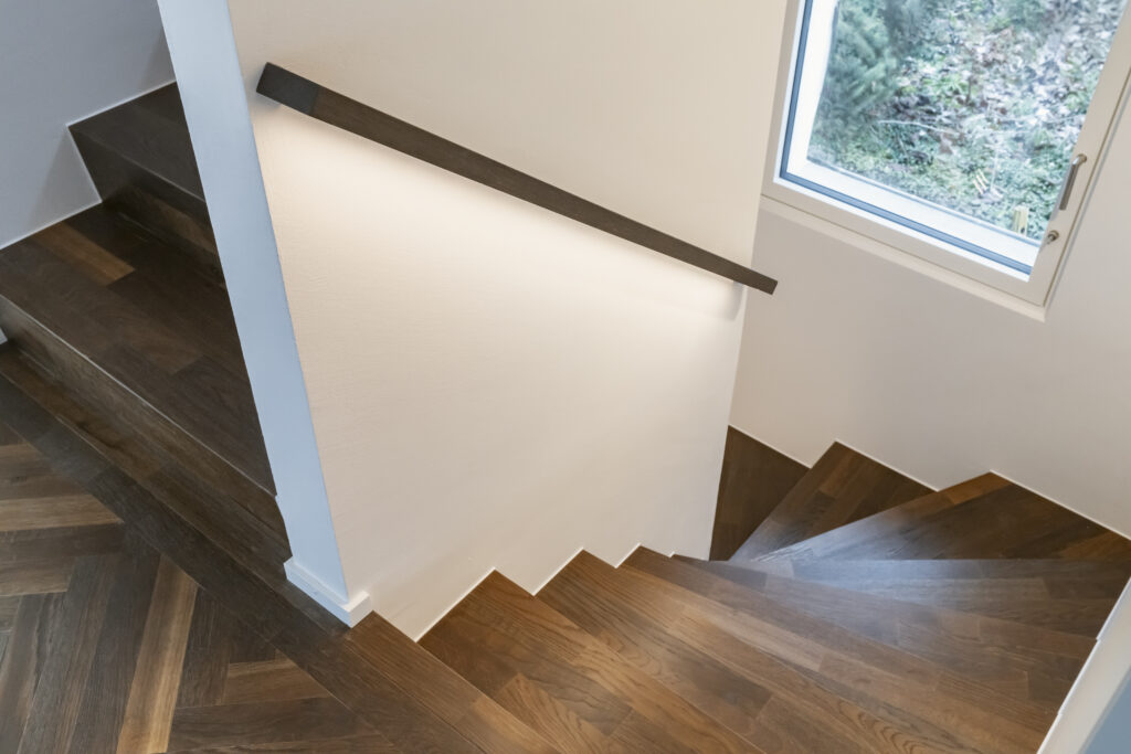 Bodenbelag: Fertigparkett Weitzer Stab 500, Eiche kerngeräuchert, Treppentritte schiffsbodenartig, Fläche Fischgratmuster