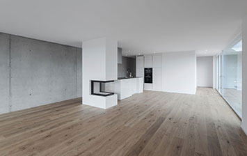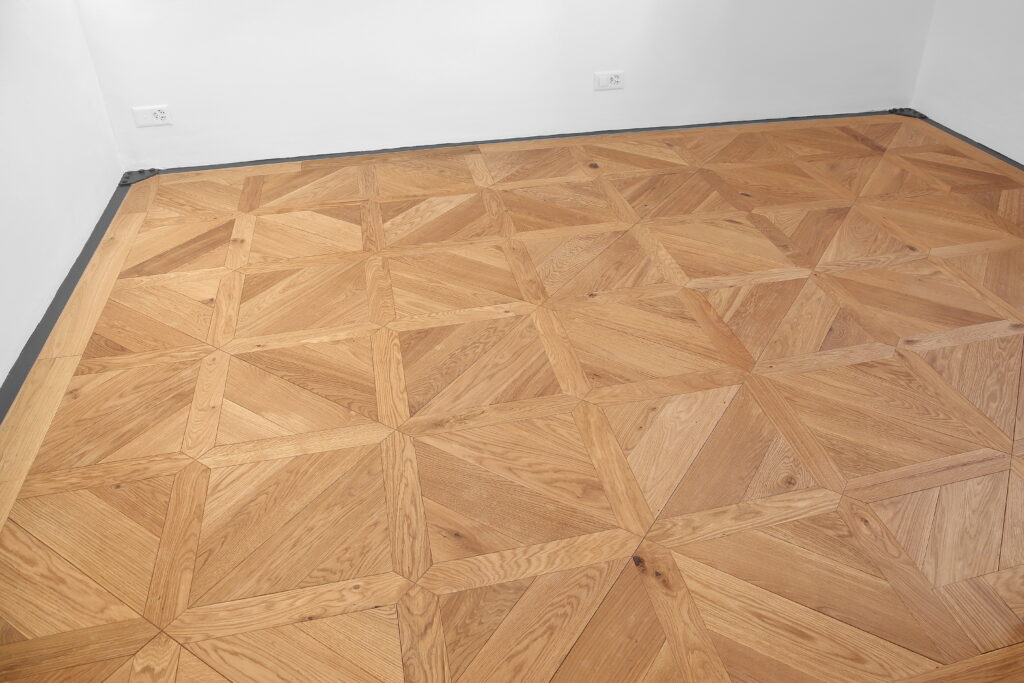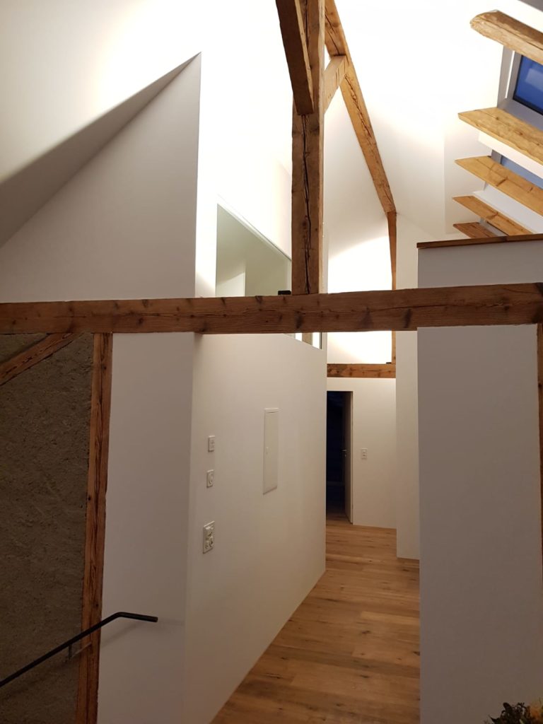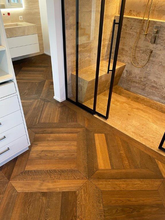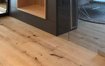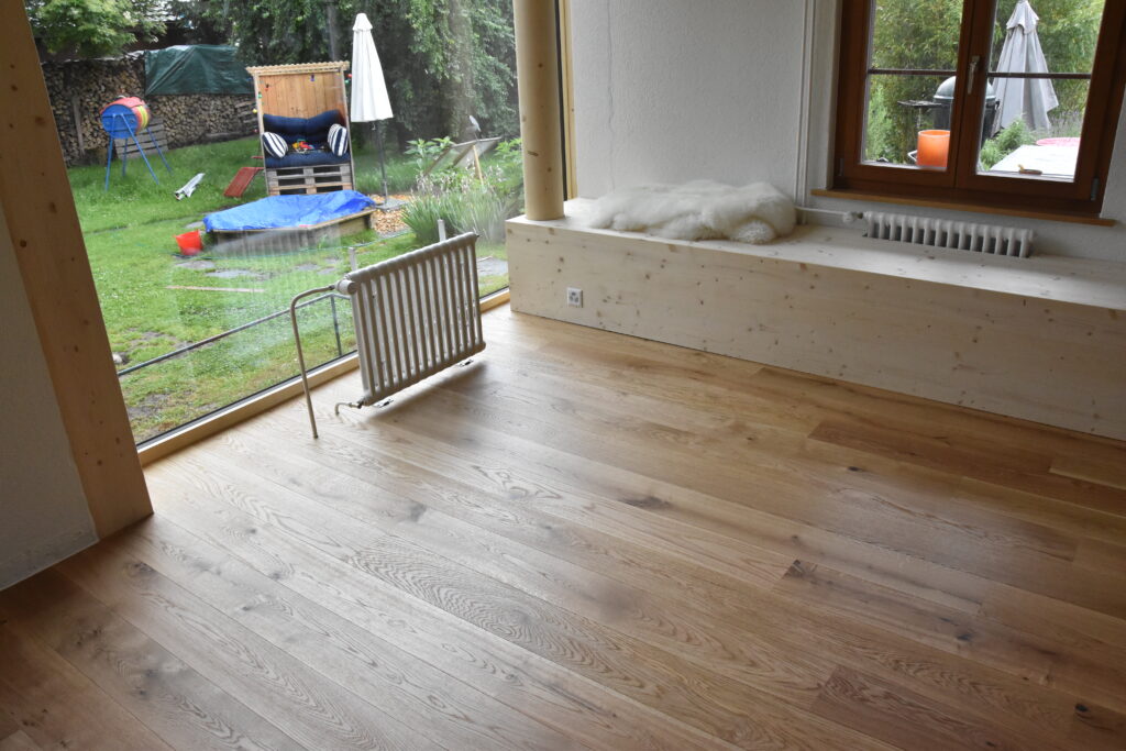 Bodenbelag: Fertigparkett Weitzer Stab 500, Eiche kerngeräuchert, Treppentritte schiffsbodenartig, Fläche Fischgratmuster
